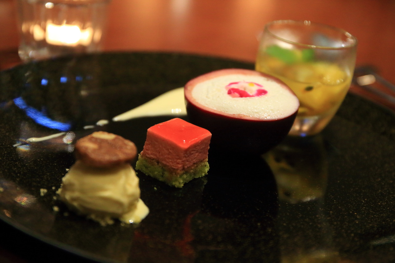 左から、マダガスカル産バニラアイスとココアクッキー、ベリームースと抹茶のケイク、パッションフルーツの器に豆乳のブランマンジェ、白ワインのゼリー、パイナップルとメロン、パッションフルーツ、アクセントに黒胡椒のソースを添えて。贅沢にも4種のスイーツの盛り合わせとなります!